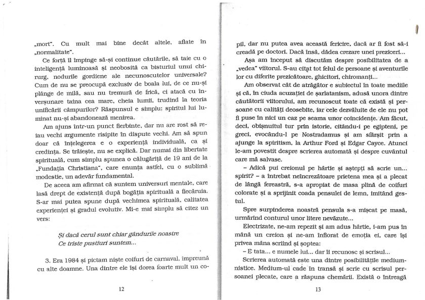 - Vă rog să citiți cu mare atenție întreaga carte și să reflectați asupra ei. Oricare dintre noi are capacitatea de a comunica cu cei pe care nu îi mai vedem în corp, dar care există, mai departe, într-o formă mult mai subtilă. Totul este să avem o dorință arzătoare în acest sens, să perseverăm în a încerca și să ne dezvoltăm cât mai mult ființa sufletească, prin deschiderea maximă a centrilor energetici și nu numai.